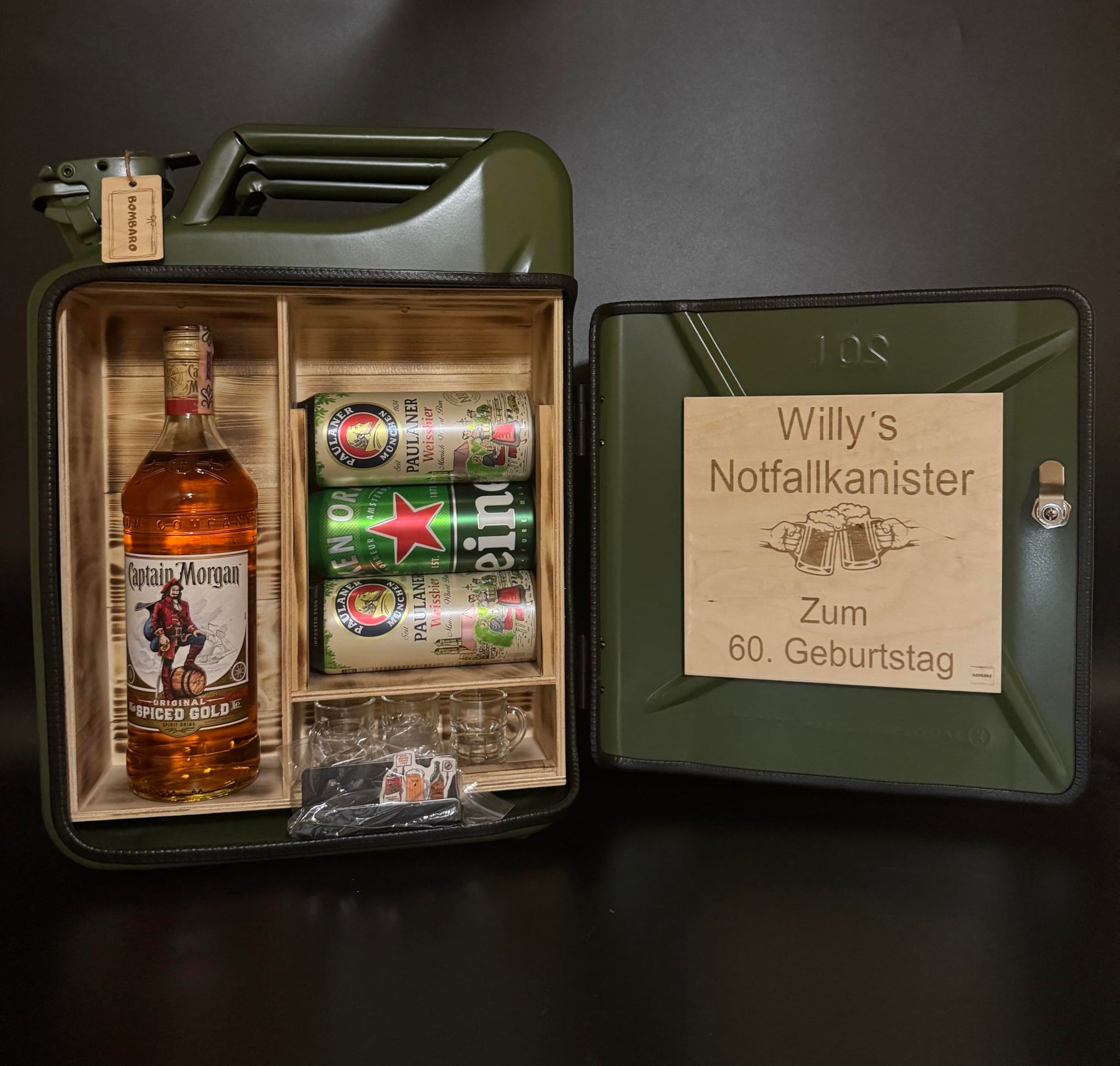Der 20 L Kanister mit Gravur ist die perfekte Kombination aus Stil und Funktion. Diese abschließbare Minibar verwandelt einen klassischen Jerrycan in eine elegante Kanisterbar mit Holzinterieur.